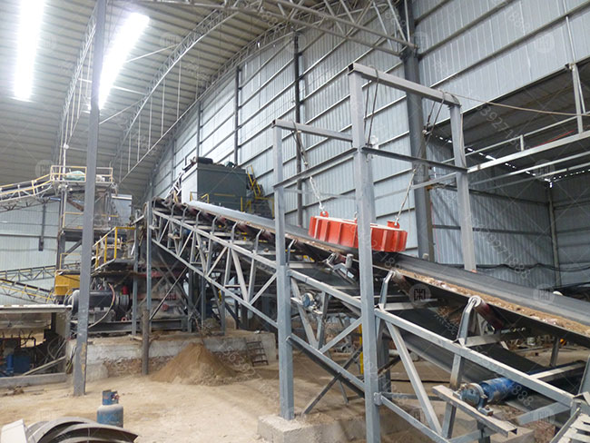 該制砂生產(chǎn)線原料為河卵石,設(shè)計(jì)時(shí)產(chǎn)量200噸,原料河卵石由運(yùn)輸車(chē)從河道運(yùn)到料廠,然后通過(guò)料倉(cāng)均勻送到PE750*1060顎式破碎機(jī),進(jìn)行粗破,粗破后的物料進(jìn)入單缸440圓錐破碎機(jī),圓錐破出來(lái)的料送到振動(dòng)篩,振動(dòng)篩上料再回到HP300多缸圓錐破碎機(jī)進(jìn)行制砂,從多缸圓錐破碎機(jī)出來(lái)的料,再次進(jìn)入振動(dòng)篩內(nèi)篩分,篩分出滿足要求的砂子,進(jìn)入洗砂機(jī)進(jìn)行清洗,清洗后由成品輸送機(jī)輸送出既成品。本制砂生產(chǎn)線形成2段閉路循環(huán),采用單缸圓錐破碎機(jī)和多缸圓錐破碎機(jī)配置,出砂率高、易損件少!